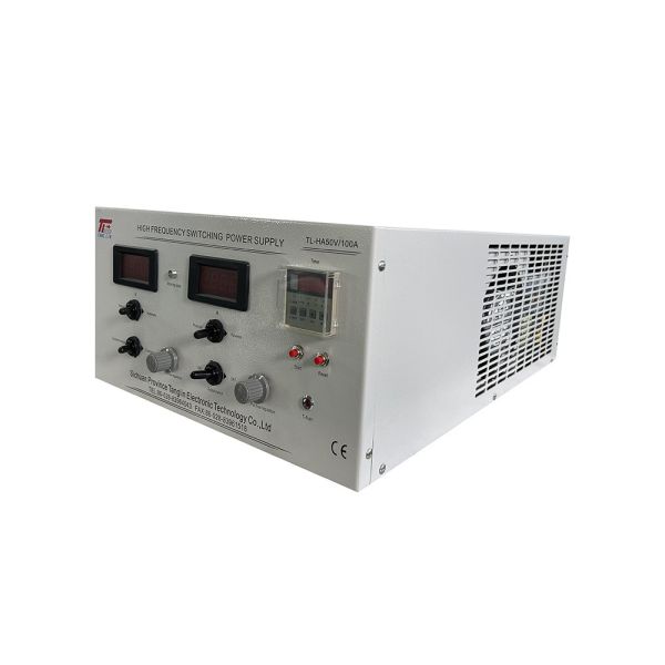 Parameter Value Input Voltage AC 220V ±10% (Single-phase, adaptive to 50/60Hz) Output Voltage DC 0-50V adjustable (Positive/negative polarity can be switched) Output Current DC 0-100A adjustable Maximum Power 5KW (50V × 100A) Reversing Function Supports manual/auto polarity switching (Period can be programmed) Efficiency ≥88% (High-frequency IGBT technology) Ripple Coefficient ≤1% (Low-noise output) Cooling Method Intelligent air cooling (Thermostatic speed regulation) Control Mode Local control panel + RS485 remote communication Protection Function Overvoltage/overcurrent/short circuit/overheat/phase loss protection Dimensions (Width×Height×Depth) 500×400×250mm (Compact type) Weight 45kg Working Environment -10℃ ~ 45℃, humidity ≤90% RH (No condensation) II. Product Description Core Functions Bidirectional current output: Supports fast switching of positive/negative polarity (Reversing time < 1 second), suitable for processes such as electrolytic polishing and reverse electroplating that require periodic reversing. High-precision control: The voltage/current resolution reaches 0.1V/0.1A, suitable for high-precision scenarios such as precious metal electroplating (e.g., gold plating, silver plating). Intelligent heat dissipation: The temperature-controlled fan automatically adjusts the speed according to the load, with a noise level < 60dB, and supports continuous operation for 24 hours. Technical Advantages High-frequency IGBT topology: The efficiency ≥ 88%, which is 15% more energy-efficient than traditional silicon-controlled rectifiers. Multiple protection mechanisms: Automatically reduces the rating in case of overload, cuts off instantly in case of a short circuit, and has an IP20 protection level. Flexible control: Supports local knob adjustment or remote RS485 communication (Optional 0-5V/4-20mA analog signal control). Typical Applications Surface treatment: Electrolytic polishing of aluminum materials, electrochemical cleaning of stainless steel. Precision electroplating: Micro-hole copper plating on PCBs, gold plating of connectors. Laboratory research and development: Verification of process parameters for small-batch electroplating.